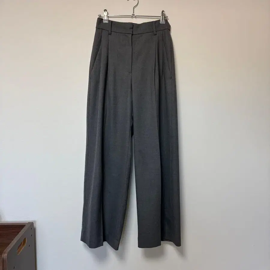 그레이 색상의 와이드 팬츠, 플리츠 디자인, 사이드 포켓 포함.
