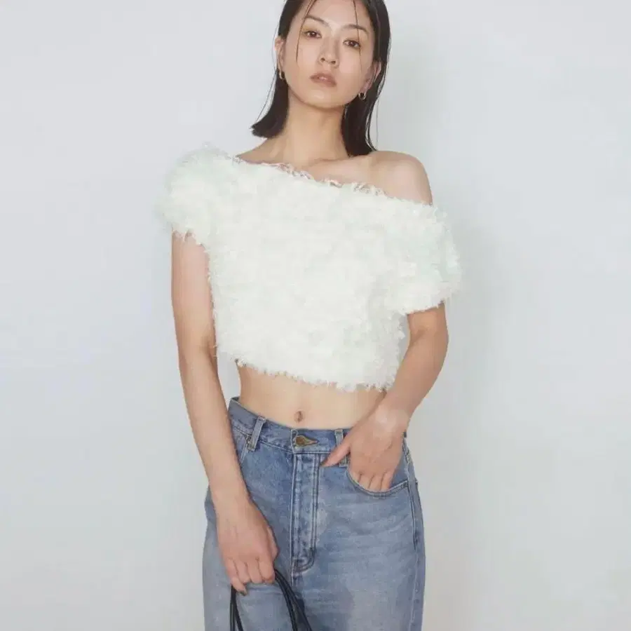 복슬복슬한 푸들풍 컬 니트를 사용한 탑이 등장. 보트넥과 오프숄더, 2WAY 디자인이 기쁜 포인트.