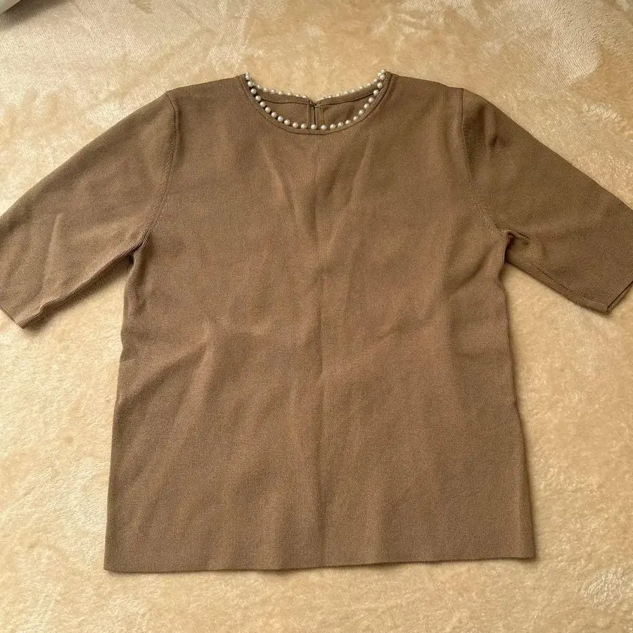 브라운 반팔 니트 펄 장식 포함