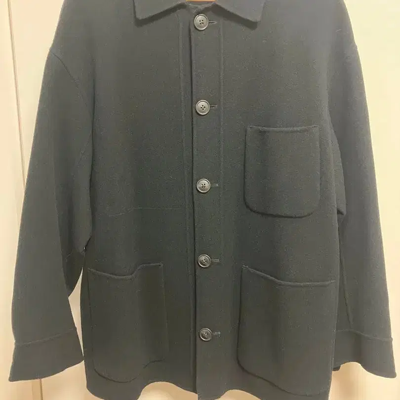 울 혼방의 네이비 색상 커버올, 버튼 프론트와 포켓이 있어 스타일리시합니다.