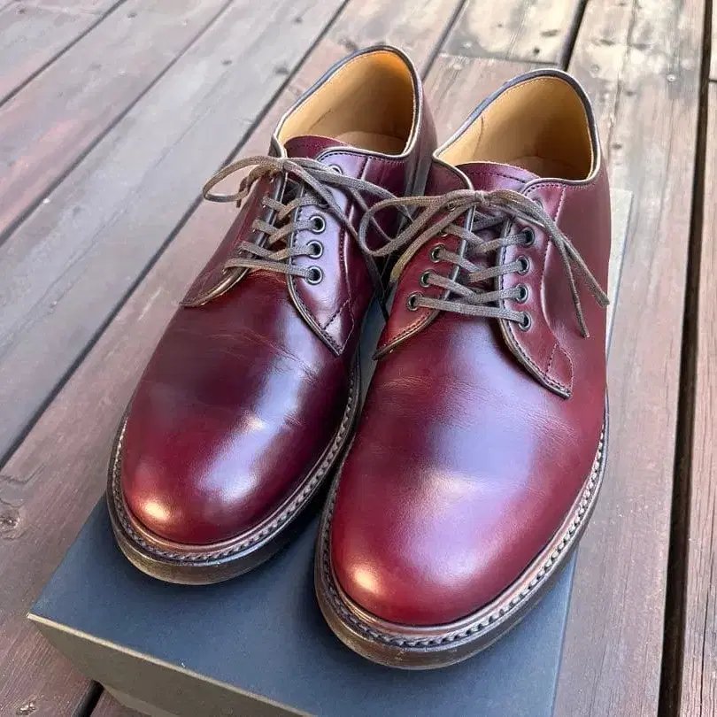 휠 로브(WHEEL ROBE) 제조 플레인토(PLAIN TOE) 레어템. 호윈(Horween)사 크롬엑셀(Chromexcel) 소재이며 색상은 버건디입니다. 멋집니다. 새상품 구매 후, 양말을 착용하고 근처를 걸은 것이 전부입니다. 깨끗한 상품이라고 생각합니다만, 일단 타인의 손을 거친 물건입니다. 또한, 천연 소재를 사용한 제품이므로 요철, 주름, 색상 불균일 등은 소재 유래의 특징이 있으므로 이해해 주시기 바랍니다. 예민하신 분의 구매는 삼가해 주시기 바랍니다. 또한 교체 방지를 위해 반품은 받지 않습니다. 12/31~1/4에 구매하신 경우 발송이 불가능하므로, 발송 일정을 별도로 조정해 주시기 바랍니다. 잘 부탁드립니다. — -이하, 자동 생성 — 호윈(Horween) 크롬엑셀(Chromexcel) 소재의 버건디 색상 플레인토(PLAIN TOE) 브루허(BLUCHER), 핸드메이드 고품질 신발입니다. - 브랜드: WHEEL ROBE - 모델명: PLAIN TOE BLUCHER - 색상: 버건디 - 소재: 호윈(Horween) 크롬엑셀(Chromexcel) - 사이즈: 7 1/2 E 방문해 주셔서 감사합니다. 사이즈 - 25.5cm E 와이드 색상 - 브라운 계열 소재 - 천연 가죽 얼룩, 찢김, 냄새 등 - 없음