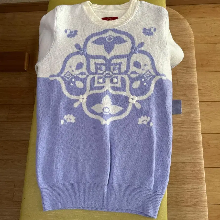화이트와 연보라색 무늬가 들어간 긴팔 니트 스웨터