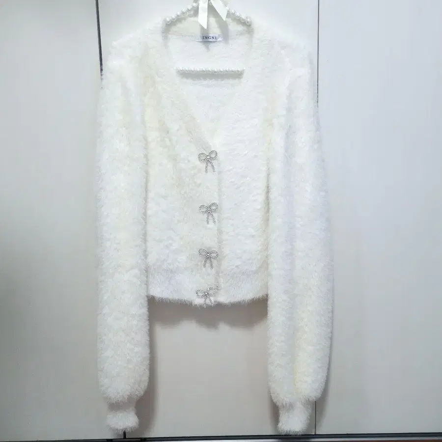 INGNI V넥 리본 버튼 페더 니트 가디건 아이보리 화이트 M