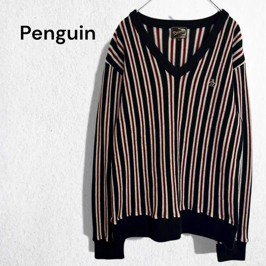 펭귄 니트 스웨터 스트라이프 패턴 울 100% 일본제 V넥 L
