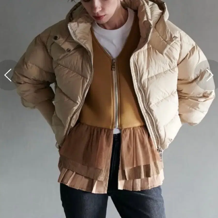 하이웨스트 하의에 어울리는 숏 기장의 다운 자켓.