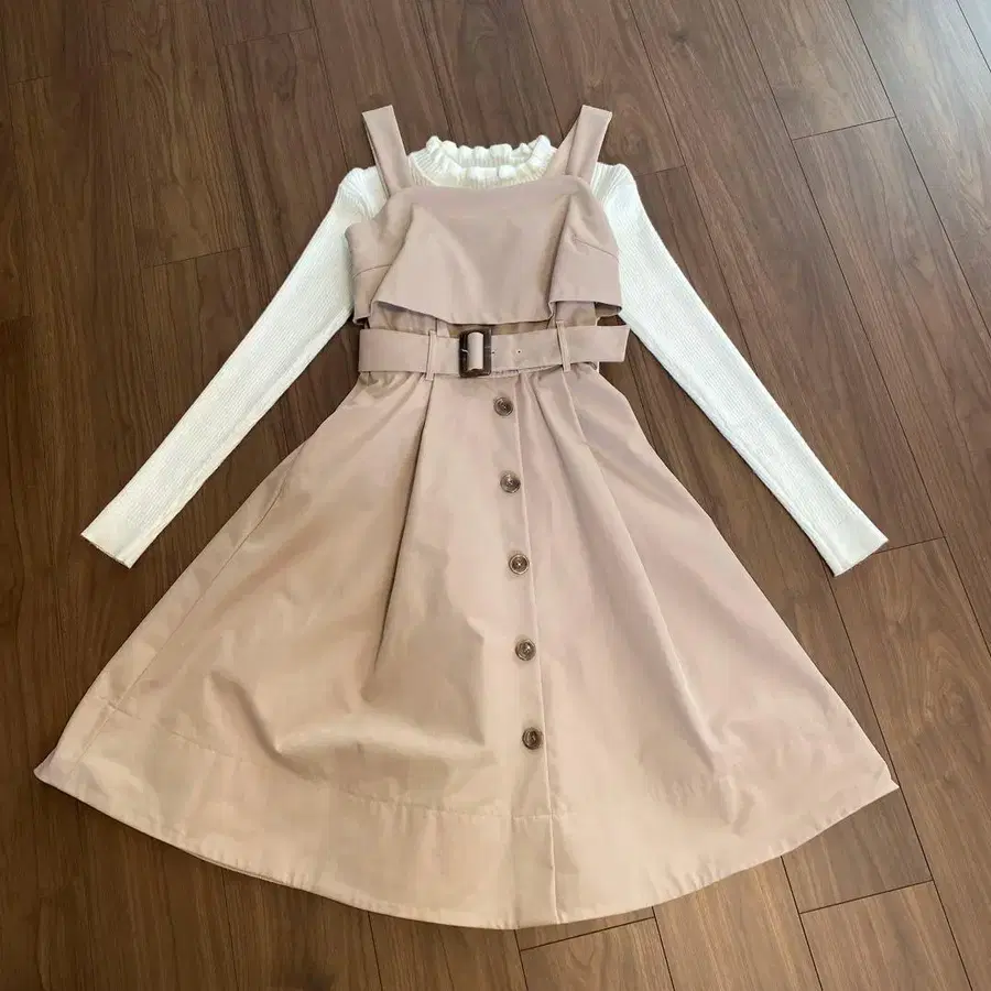 프릴이 달린 베이지 A라인 원피스, 긴팔과 허리 벨트가 특징입니다.