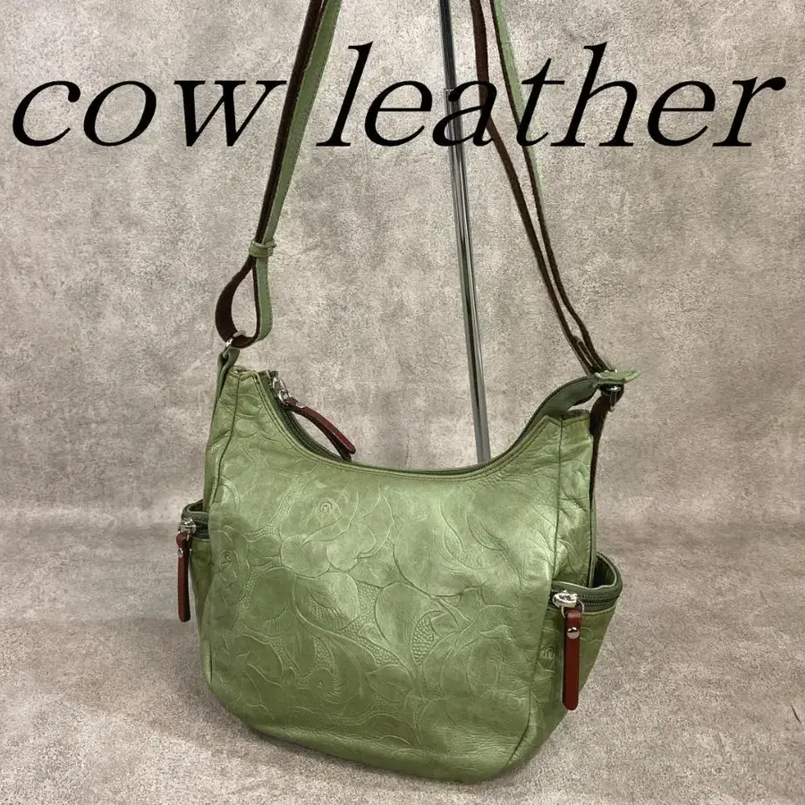 [ 미사용 ] 소가죽 일본제 경량 장미 패턴 엠보싱 숄더백 카키