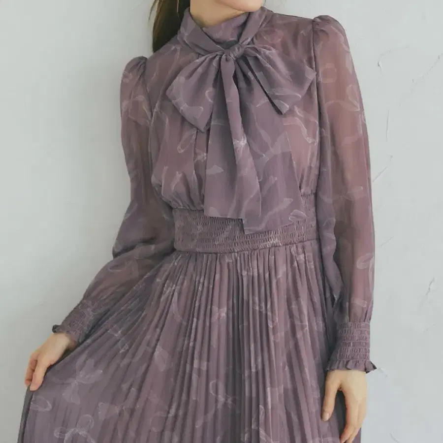 토코 클로젯 보타이 리본 프린트 셔링 플리츠 원피스