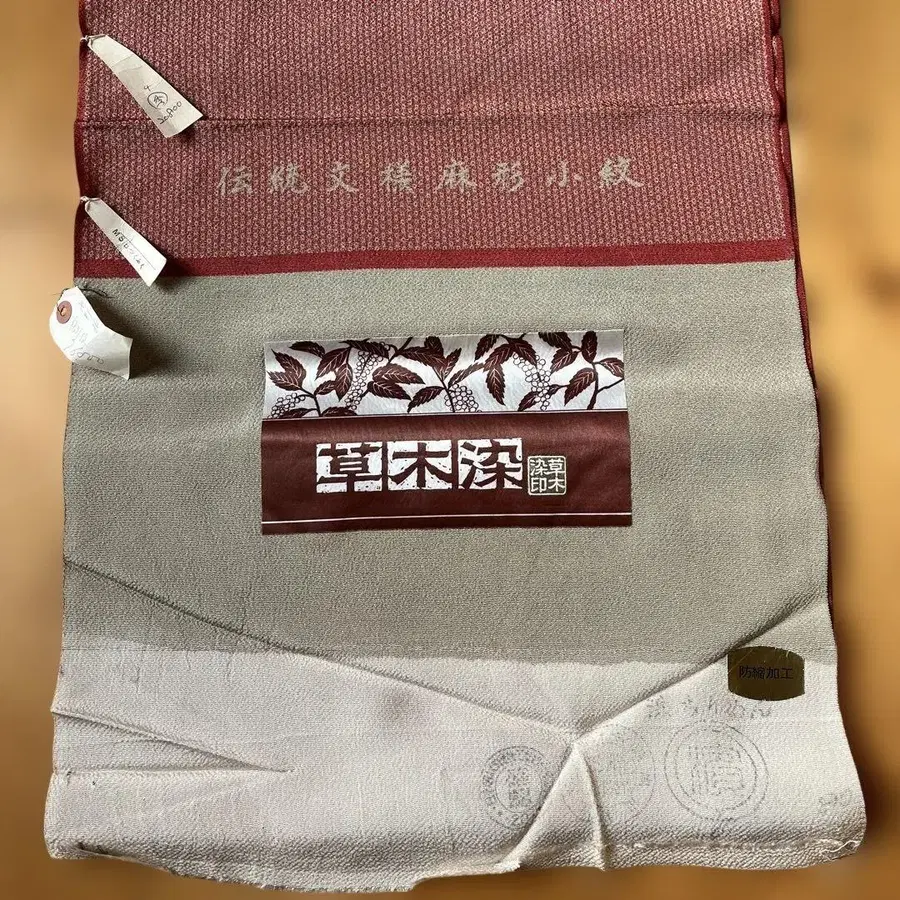 실크 기모노 옷감 빨간색 초목 염색 실크 크레이프 원단, 방축 가공