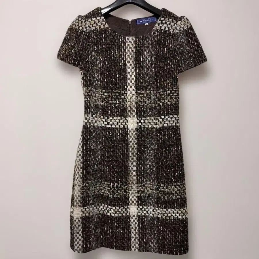 브라운 계열의 라메 믹스 체크 무늬 반팔 무릎 기장 울 원피스.