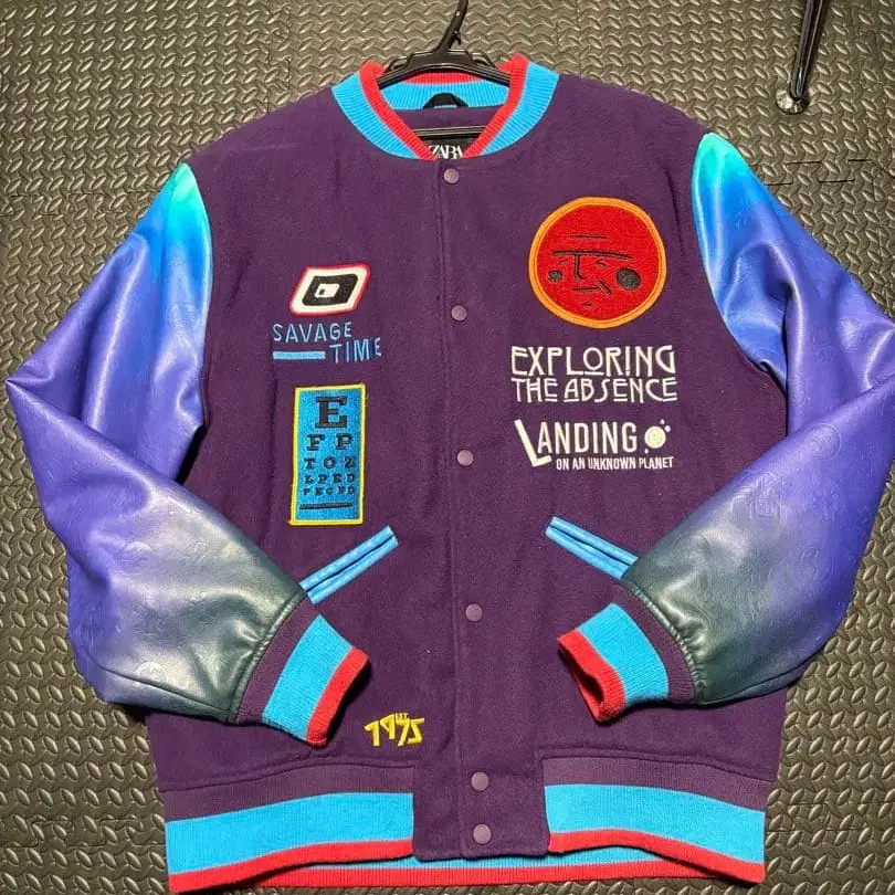 우주 테마 바시티 자켓 보라색 파랑 빨간색