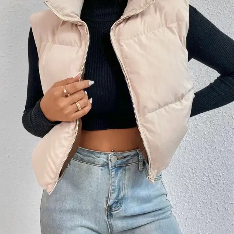 베이지 다운 베스트 지퍼 포함