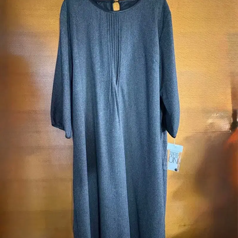 가슴 부분 핀턱 디테일이 있고, 길고 넉넉한 실루엣의 원피스입니다. 원단이 탄탄하지만, 소매가 7부 길이로 되어 있어 얇은 터틀넥 등과 함께 입으면 방한과 멋을 동시에 잡을 수 있을 것 같습니다.