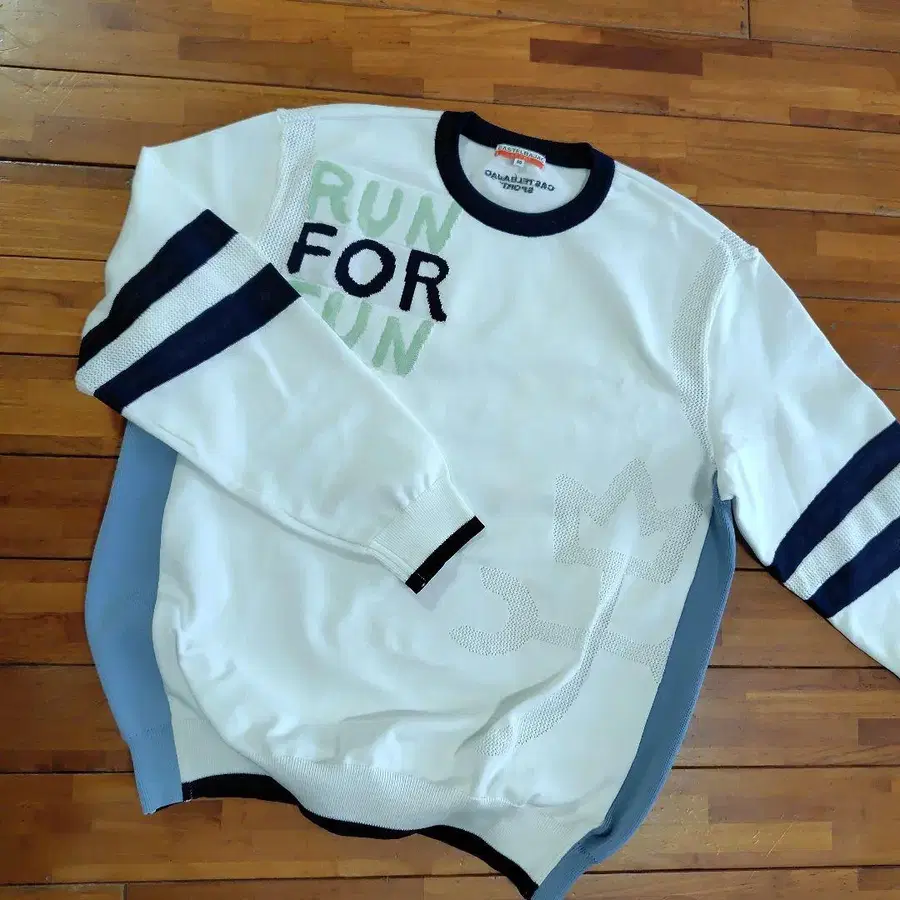 CASTELBAJAC (까스텔바작)의 긴팔 스웨터입니다. 프론트에는 [RUN FOR FUN]이라는 글자가 디자인되어 있으며, 소매에는 네이비 라인이 있습니다. 사이드는 스카이블루 색상으로 절개되어 있어 멋스러운 아이템입니다. 골프웨어로도 평소에도 활약하는 아이템입니다.