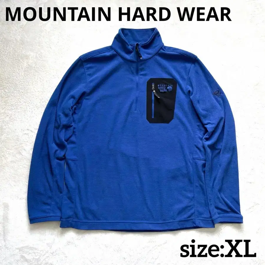 블루 색상의 하프 지퍼 플리스 자켓, 지퍼 포켓이 달린 가슴 포켓 부착.