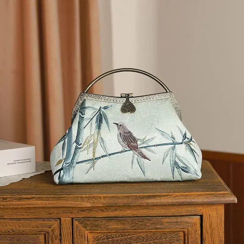 대나무와 새 자수 하늘색 일본 의류용 가방