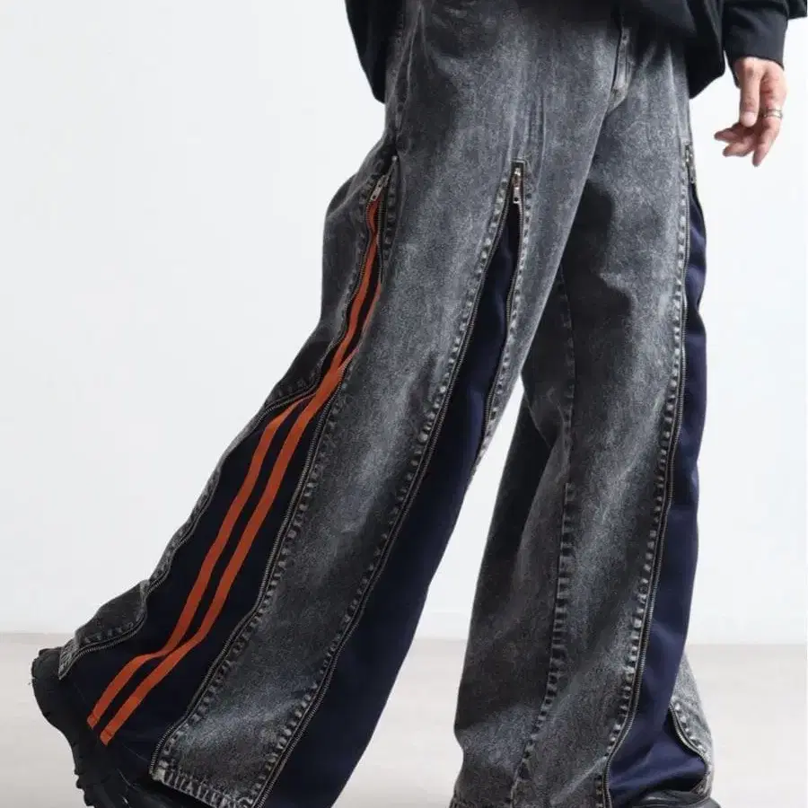 사이드 지퍼 달린 그레이 데님 팬츠