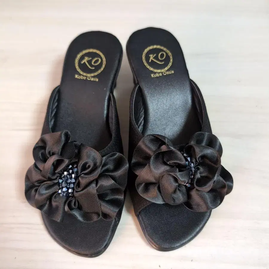 고베 오아시스 큰 코사지가 귀여운 슬림 레그 뮬 실내용 슬리퍼