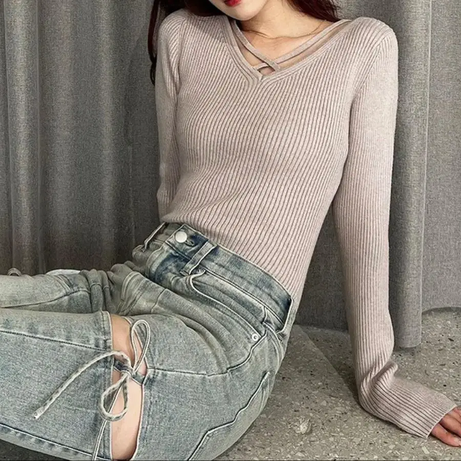 RESEXXY 데콜테 크로스 니트탑 그레이