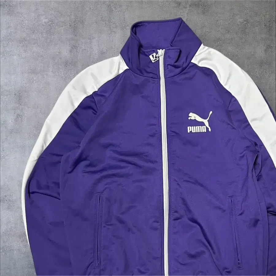 퍼플과 화이트의 대비가 특징인 풀집업 재킷.