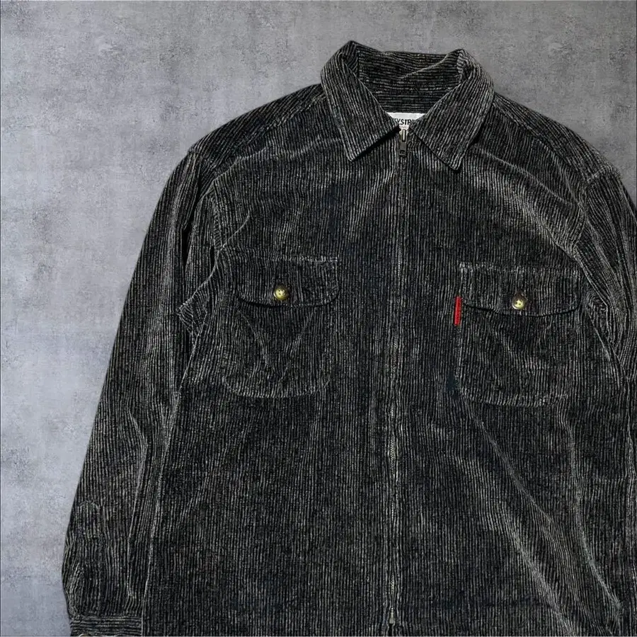 다크 그레이 색상의 코듀로이 소재, 프론트 포켓이 있는 M 사이즈 셔츠입니다.