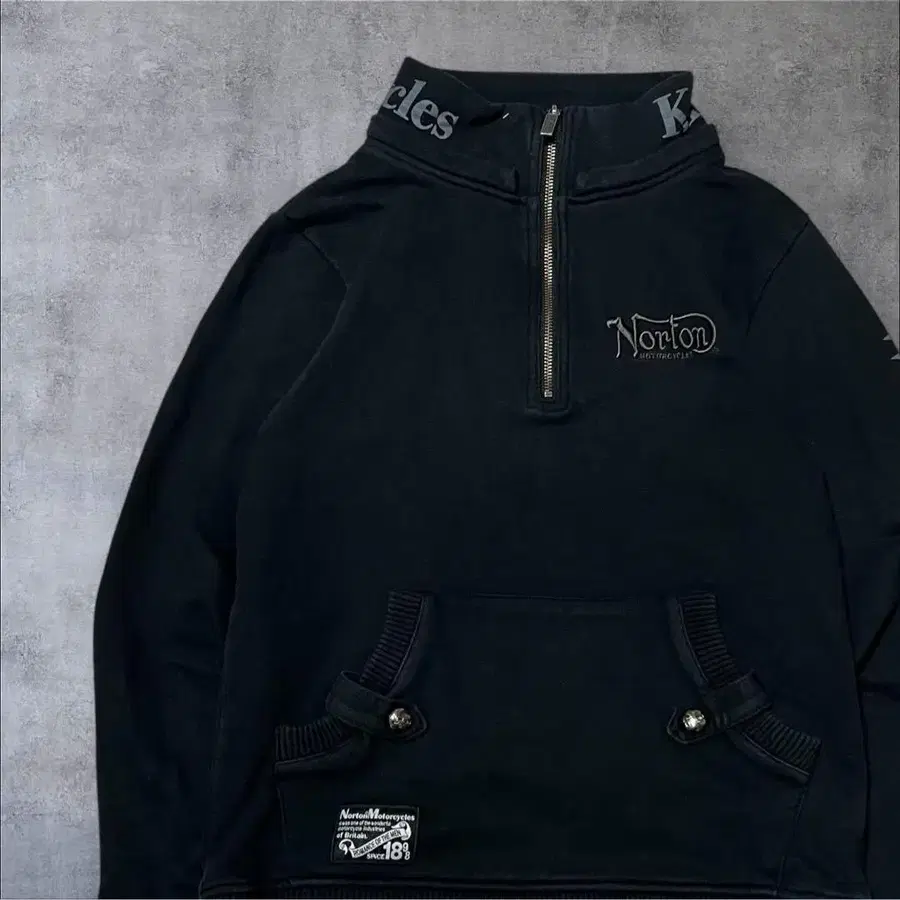 지퍼가 달린 하프넥 블랙 맨투맨, 프론트 포켓과 백 프린트가 있습니다.