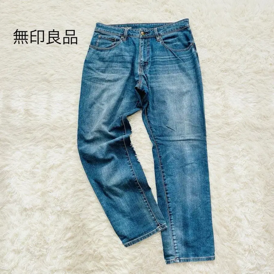 무인양품 스트레이트 데님 남성용 청바지 데미지 가공 블루 면 혼방