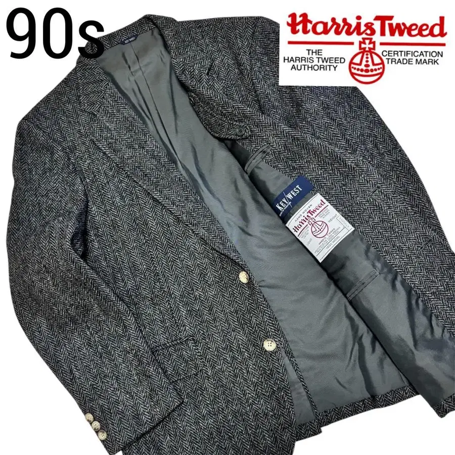 이 상품은 90s KEY WEST 해리스 트위드 테일러드 자켓 AB7 그레이 헤링본 턱 스트랩 부착 머신 스티치 키 웨스트 Harris Tweed 입니다.
