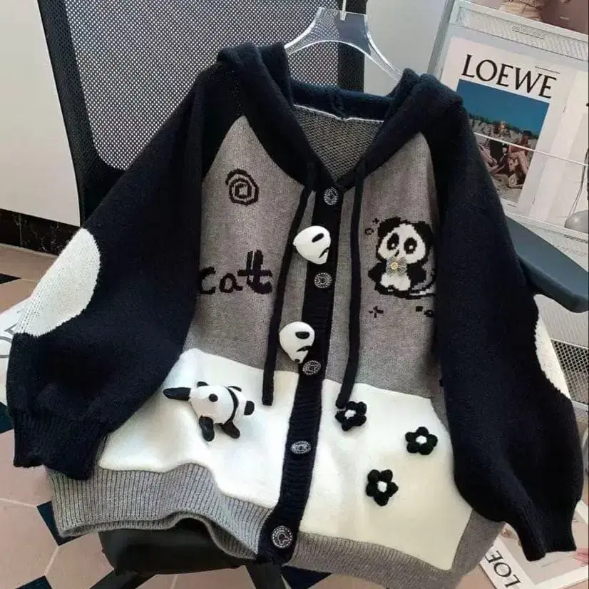 팬더 자수 후드 부착 니트 스웨터 ( 블랙 x 그레이 x 화이트 )