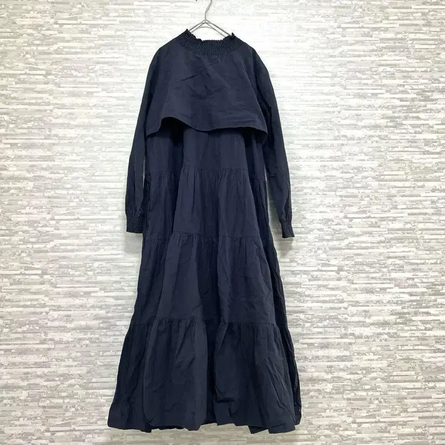 JUNOAH 롱 원피스입니다. 약간 하이넥 스타일의 셔링 옷깃과 티어드 디자인이 특징이며, 내추럴하고 여유로운 실루엣입니다. 코튼 소재로 착용감이 가볍고, 하나만으로도 멋스러운 아이템입니다.