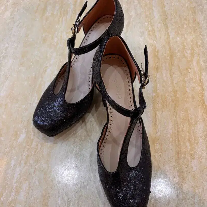 mio notis 반짝이는 라메 와이드 힐 비쥬 펌프스 스트랩 포함