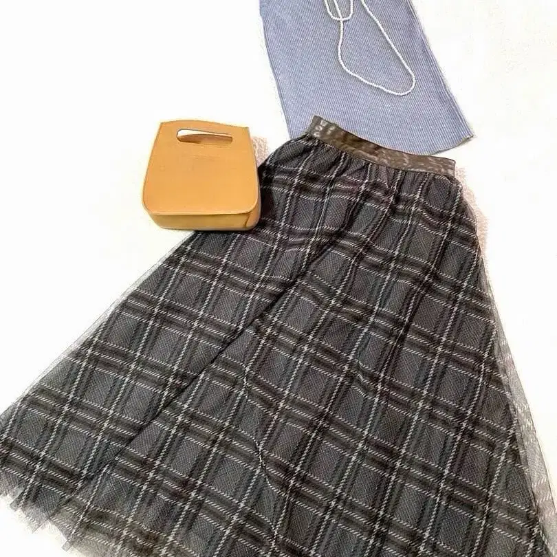[ 택 포함 미사용 ] 체크 오간자 롱 스커트