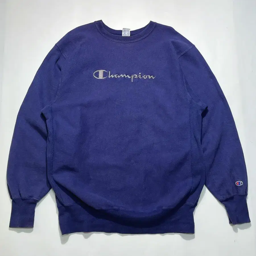 인기 있는 90년대 챔피온, XXL 사이즈 리버스 위브. 희귀한 파랑 보라색 바디에 가슴 부분에 스크립트체 자수 로고가 들어간 디자인.