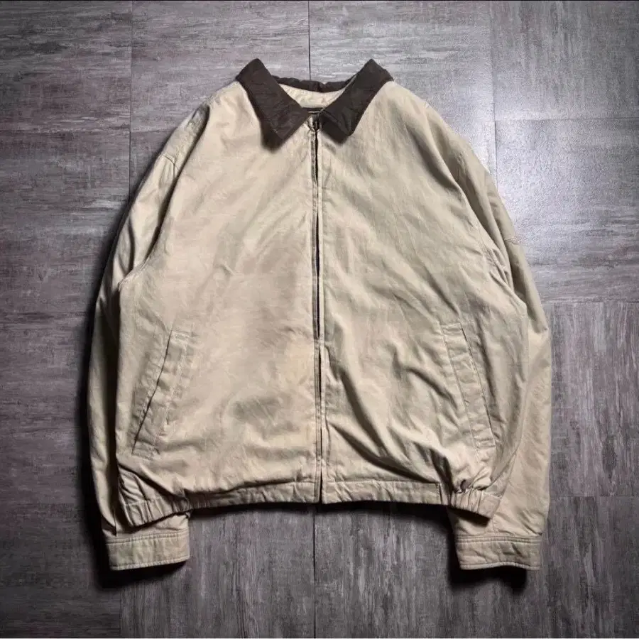 이 아우터는 90년대 제작된 [ DOCKERS ]의 나일론 패딩 자켓입니다. 넉넉한 XXL 사이즈의 오버 실루엣으로, 릴랙스한 느낌의 코디가 가능합니다. 베이지 계열의 바디에 다크 브라운의 절개 디자인이 특징인 스윙탑 형태로, 클래식한 아메카지 분위기를 가지고 있습니다. 얇은 충전솜이 들어가 있어 보온성도 갖추고 있으며, 캐주얼부터 성인 취향의 깔끔한 스타일까지 폭넓게 활용할 수 있는 아이템입니다.