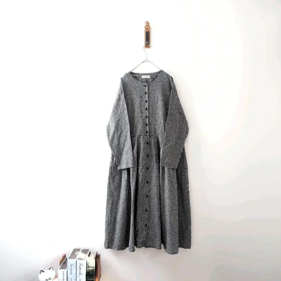 블랙과 화이트의 섬세한 깅엄 체크 패턴으로, 프론트 오픈 버튼과 허리 절개 하단의 개더가 특징적인 디자인입니다.