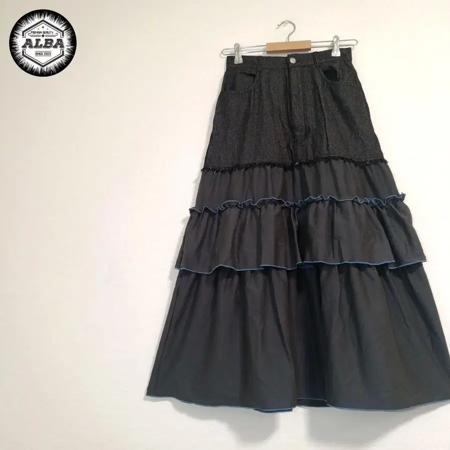 [ 새상품급 ] 플레어 스커트 데님 프릴 걸리시 롱 기장 블랙 블랙 M