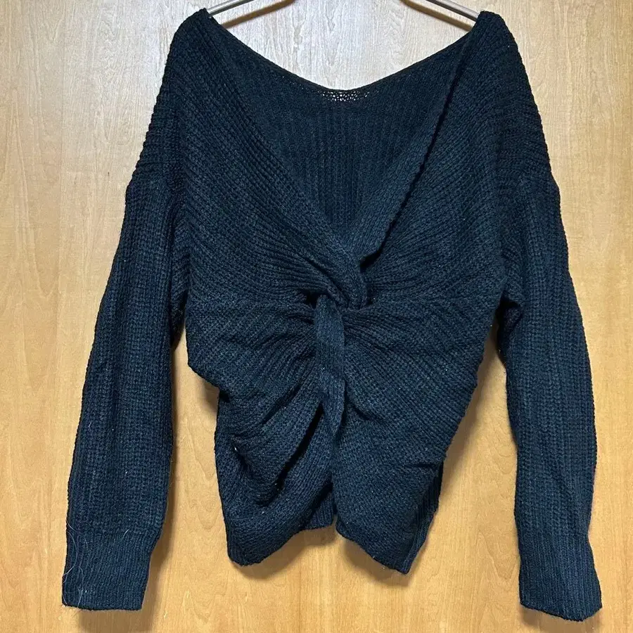 자동 번역되었어요. 원문보기V넥 앞 매듭 디자인의 블랙 스웨터.