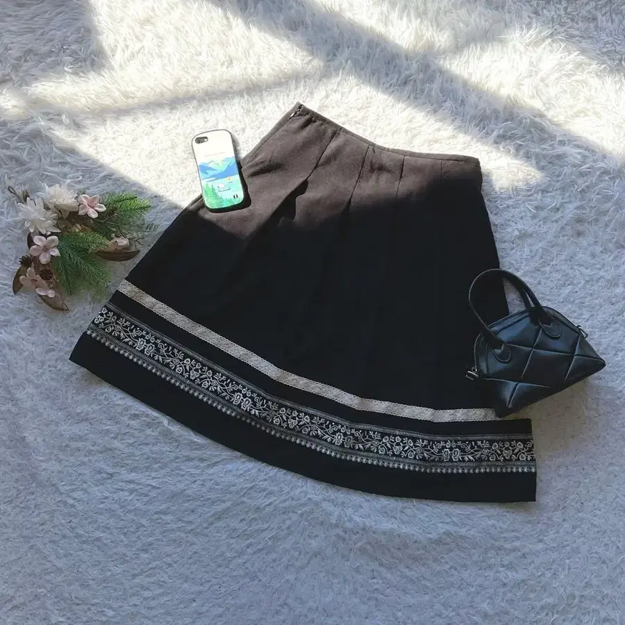 밑단에 자수 레이스를 더한 플레어 스커트입니다.