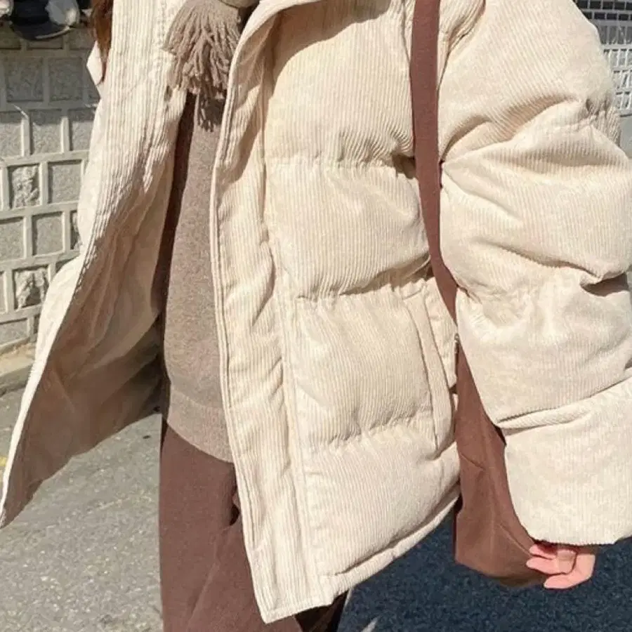 코듀로이 소재의 베이지 다운 자켓, 퀼팅 디자인으로 뛰어난 보온성.