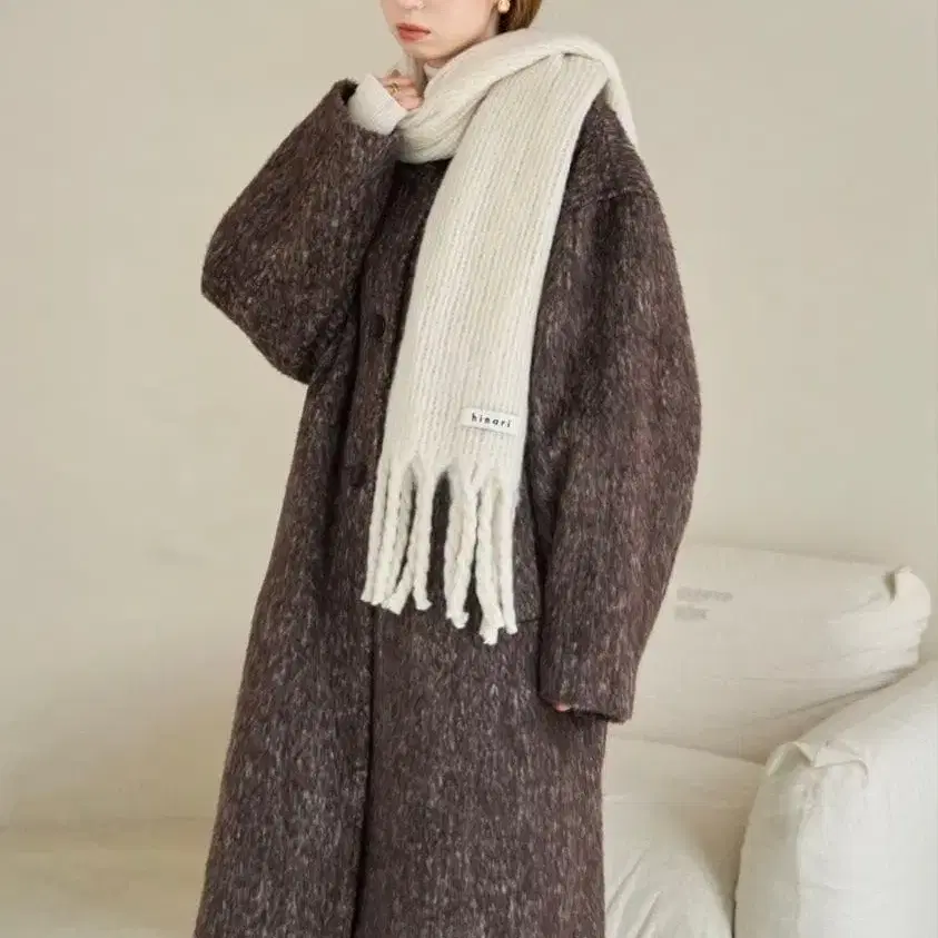 털이 길고 멜란지 느낌의 원단을 사용했으며, 표면에 기모 가공을 했습니다.