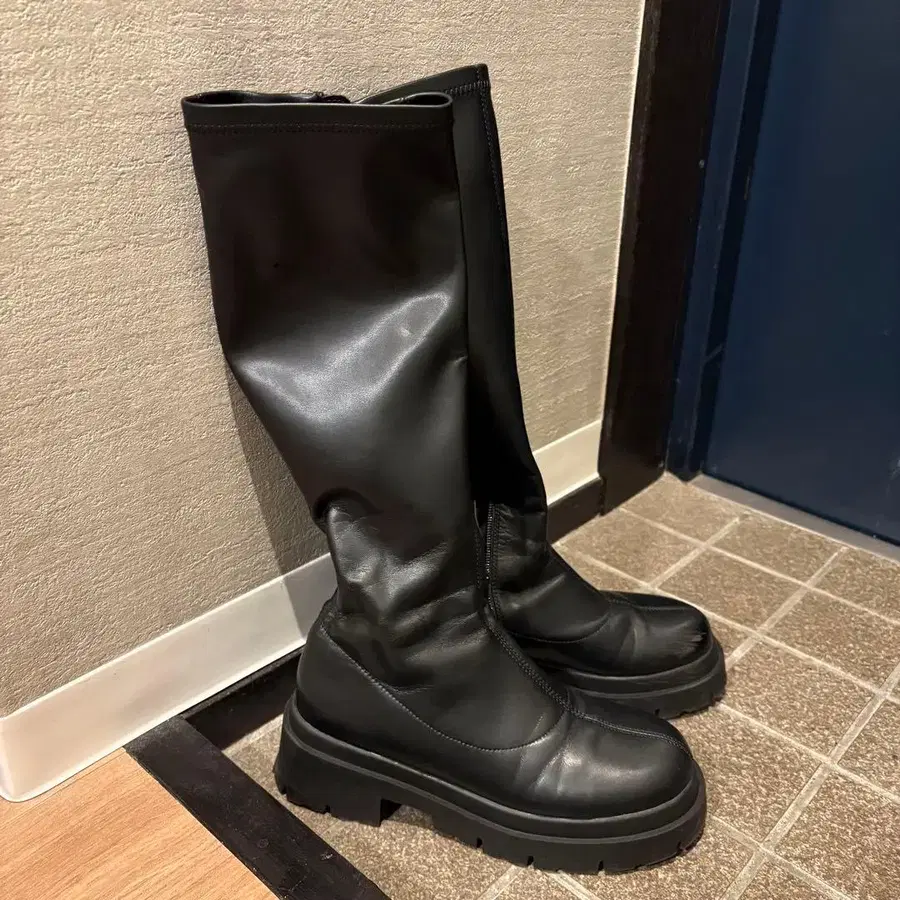 헤더 heather 블랙 롱 부츠 통굽 블랙 M 스트레치