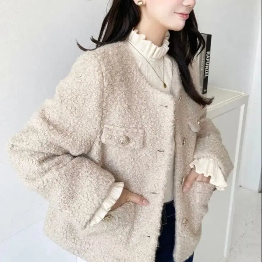 페이크 링 울 골드 버튼 노카라 자켓 moment+ 베이지