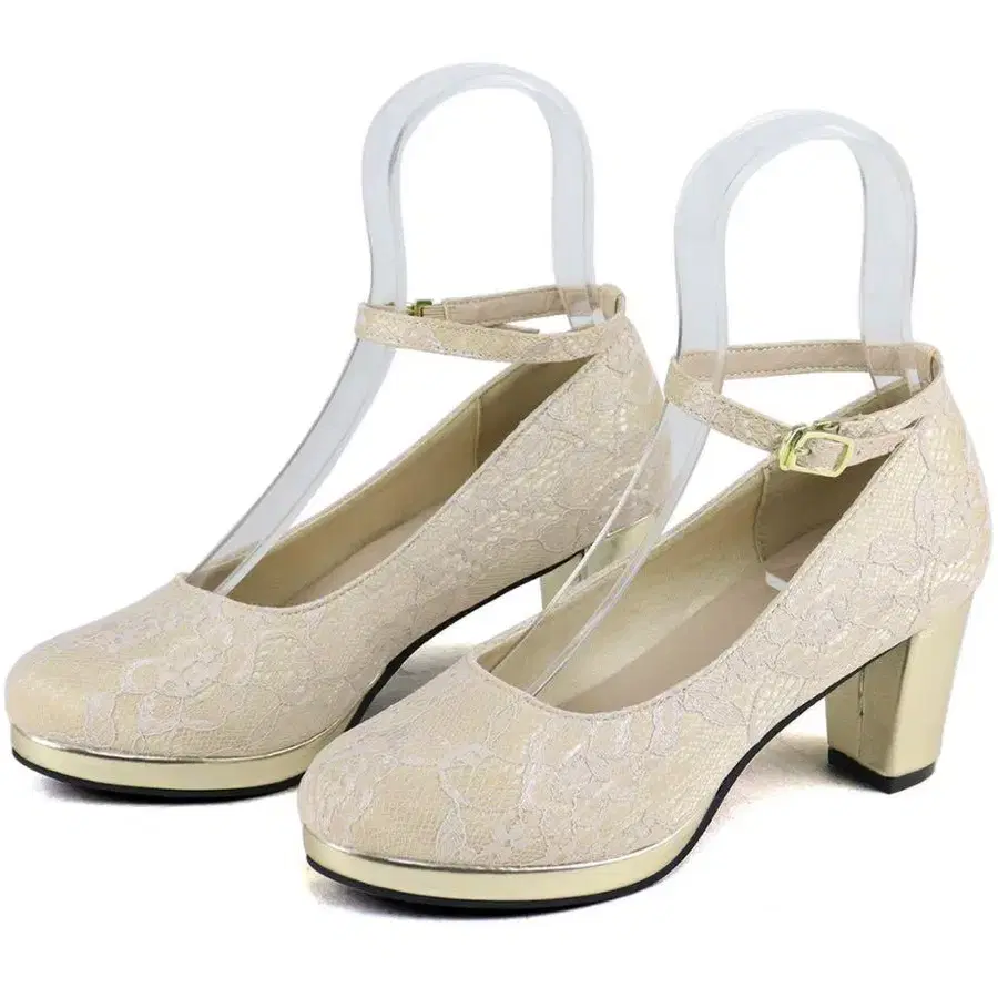 베이지 레이스 앵클 스트랩 펌프스 와이드 힐 브라이덜 신발