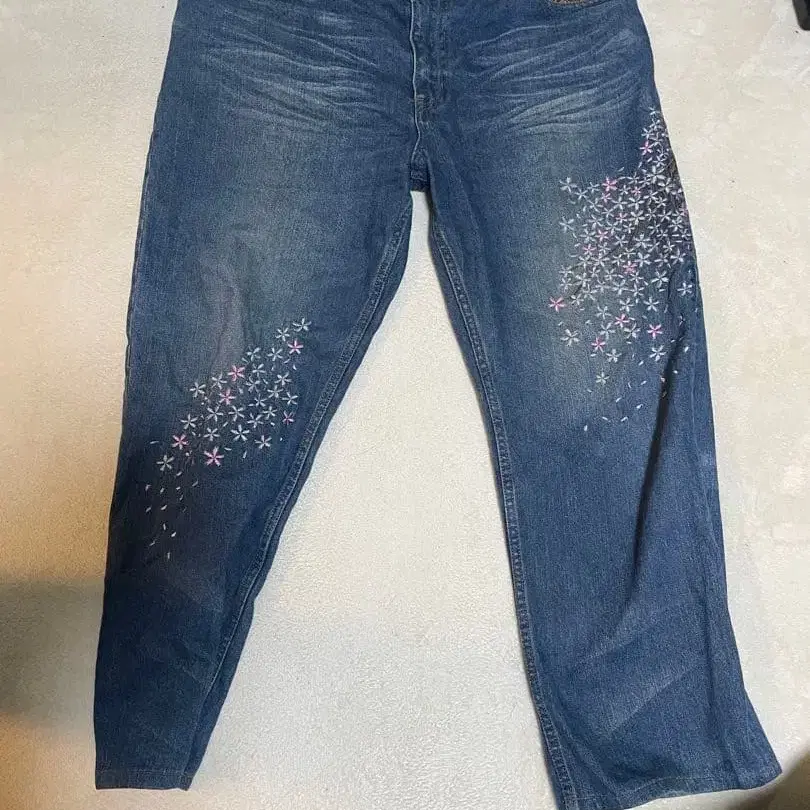 마사유키 자수 데님 팬츠 벚꽃 패턴