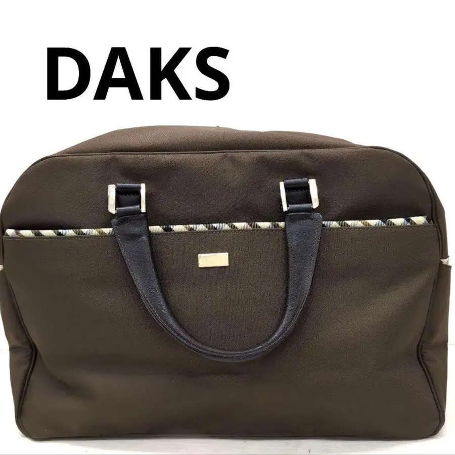 브라운 색상의 DAKS 보스턴 백, 외부에 체크 무늬 포켓 부착.