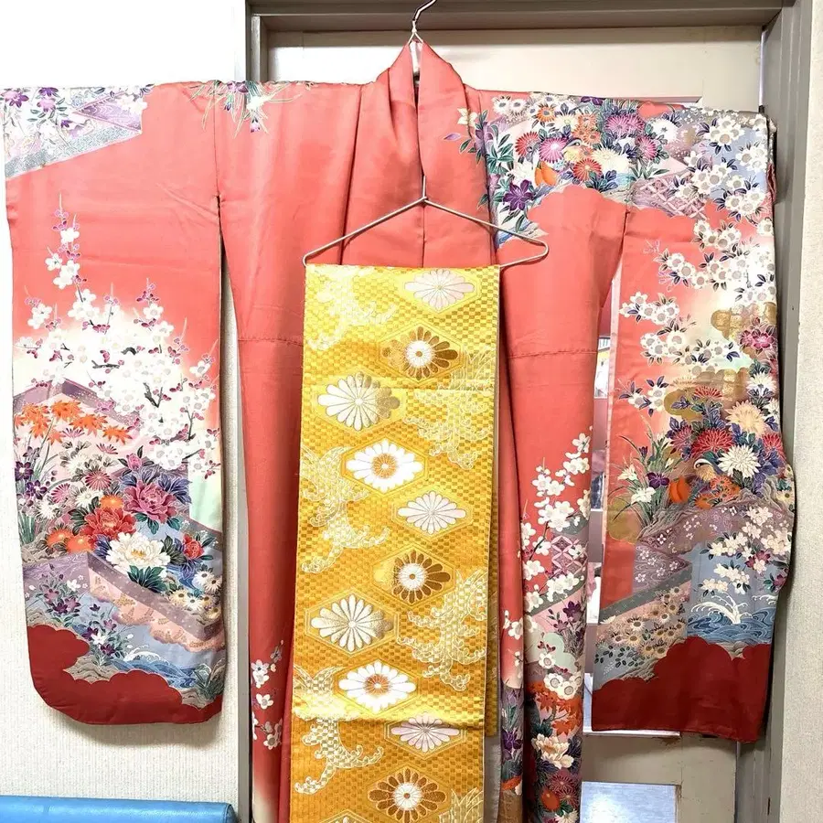 핑크 골드 후리소데 오비 복숭아색 골드 컬러 성인식