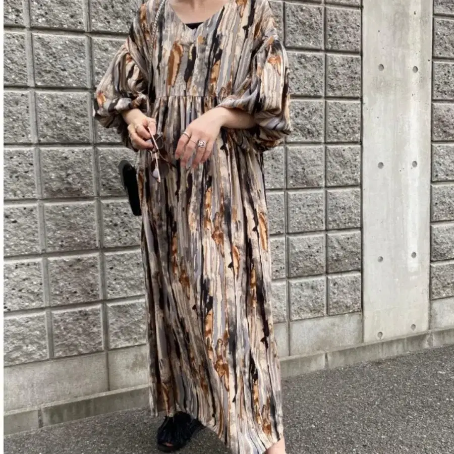 DOUDOU 소매 벌룬 프린트 원피스 페인트 패턴 브라운 계열 포근함