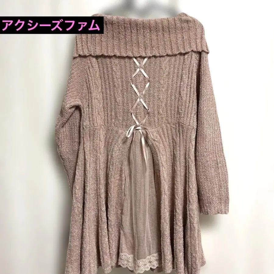엑시즈팜 오프숄더 핑크 니트 백리본 레이스