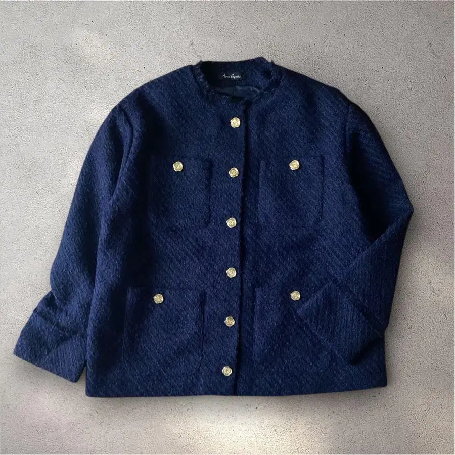 앙코키뉴 트위드 노카라 자켓 골드 버튼 프린지 네이비