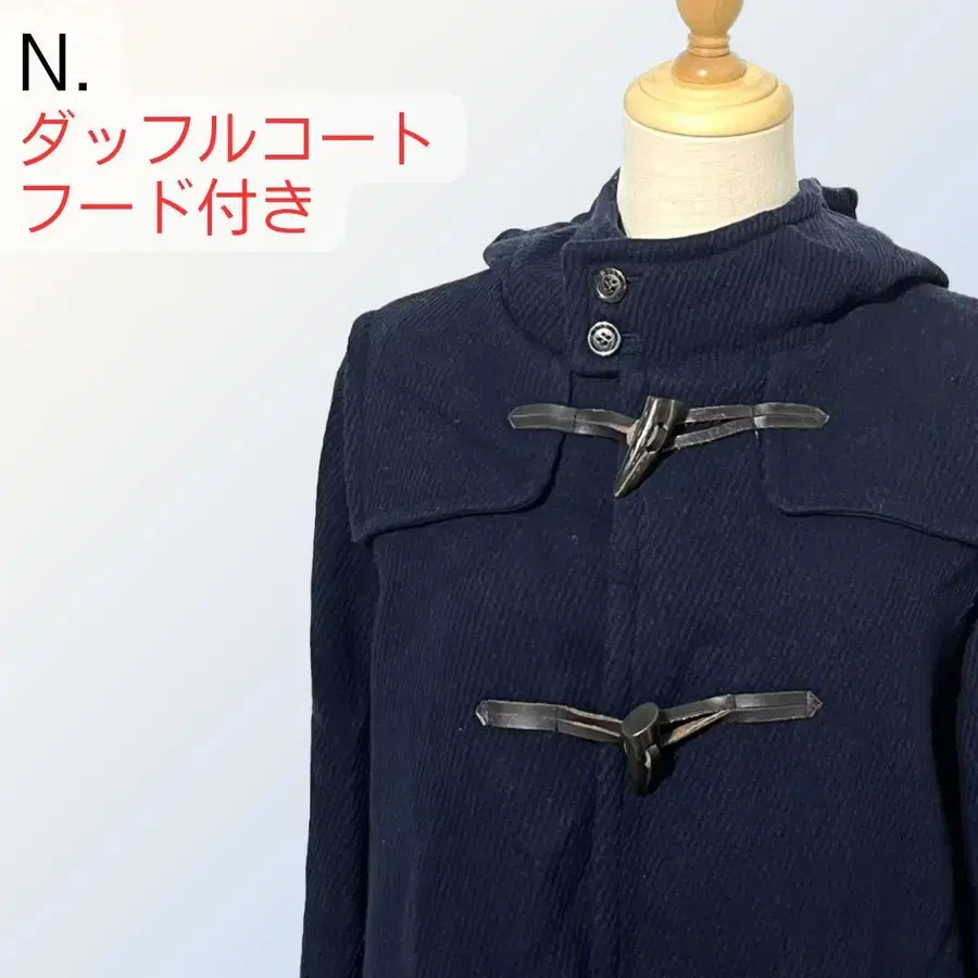 [ 상품 ] 브랜드명: N. (엔닷/엔피리어드) 아이템 종류: 더플 코트 (후드 고정형) 사이즈: M [ 상품 상세 정보 ] 소재: 겉감 모 80% 나일론 20%, 안감 폴리에스테르 100% 색상: 네이비 (깊이 있는 네이비 컬러) 상태: 사용감이 적고 전체적으로 양호한 상태입니다. 눈에 띄는 얼룩이나 손상은 없습니다. 특징: N. (엔닷)의 개성 있는 후드 고정형 더플 코트입니다. 옷깃에 후드가 꿰매어진 디자인이 특징적이며, 다른 곳에서는 찾아볼 수 없는 독특한 실루엣을 연출합니다. 천연 가죽 토글 버튼이 고급스러움을 더하며, 울 혼방 원단은 보온성과 고급스러움을 겸비하고 있습니다. 중국산. 스테디셀러 더플과는 다른 디자인성이 높은 아이템입니다. [ 사이즈 상세 정보 ] (평평하게 놓았을 때 치수 측정) 기장: 88cm 가슴 너비: 51cm 어깨 너비: 41cm 소매 길이: 58cm [ 코디네이트 제안 ] 후드 고정형이라는 개성 있는 디자인이 가장 큰 매력입니다. 캐주얼한 데님이나 치노 팬츠와 함께 심플하게 연출하는 것을 추천합니다. 네이비의 차분한 색감이 성숙한 느낌을 주며, 출퇴근이나 외출 등 다양한 장면에 활용할 수 있습니다. 겨울부터 초봄까지 길게 착용할 수 있습니다. [ 발송에 대해 ] 컴팩트하게 접어서 발송합니다. 구매 후 1~2일 이내에 발송합니다. 다른 멋진 구제 의류도 다수 판매 중입니다. 프로필도 꼭 확인해 주세요. 묶음 구매 시 할인도 상담 가능합니다. #芽依Shop_구제 의류는 여기서 확인하세요 #메루카리 우수 판매자 아이템 모음 ↑클릭하여 다른 멋진 아이템도 체크하세요 ※ 개인 측정이기 때문에 약간의 오차는 양해 부탁드립니다. ※ 구제 의류이므로 이해해 주시는 분만 구매 부탁드립니다. ※ 궁금한 점이 있다면 댓글 부탁드립니다. U1320 40